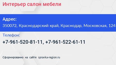 Интерьер, салон мебели по адресу 350072, Краснодарский край, Краснодар, Московская, 124 в дальнейшем Организация, размещена в следующих категориях: