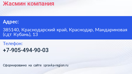 Жасмин, компания по адресу 385140, Краснодарский край, Краснодар, Мандариновая (сдт Кубань), 13 в дальнейшем Организация, размещена в следующих категориях: