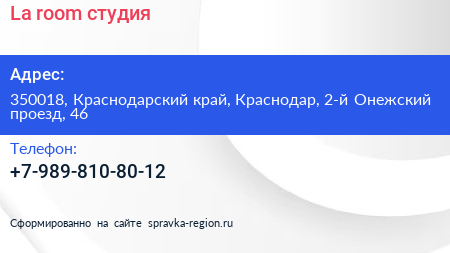 La room, студия по адресу 350018, Краснодарский край, Краснодар, 2-й Онежский проезд, 46 в дальнейшем Организация, размещена в следующих категориях: