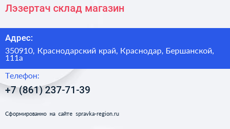 Лэзертач, склад-магазин по адресу 350910, Краснодарский край, Краснодар, Бершанской, 111а в дальнейшем Организация, размещена в следующих категориях: