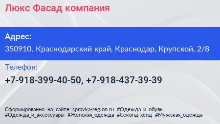 Люкс Фасад, компания по адресу 350910, Краснодарский край, Краснодар, Крупской, 2/8 в дальнейшем Организация, размещена в следующих категориях: