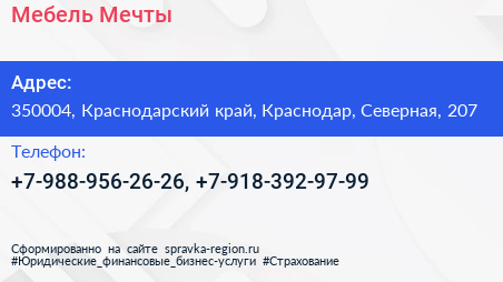 Мебель Мечты по адресу 350004, Краснодарский край, Краснодар, Северная, 207 в дальнейшем Организация, размещена в следующих категориях: