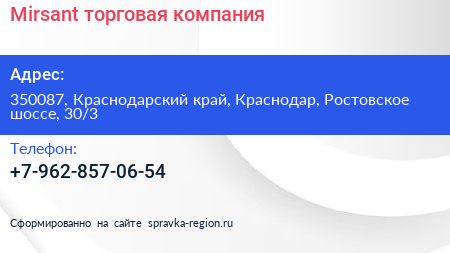 Mirsant, торговая компания по адресу 350087, Краснодарский край, Краснодар, Ростовское шоссе, 30/3 в дальнейшем Организация, размещена в следующих категориях: