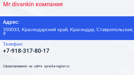 Mr.divankin, компания по адресу 350033, Краснодарский край, Краснодар, Ставропольская, 9 в дальнейшем Организация, размещена в следующих категориях: