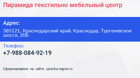 Пирамида, текстильно-мебельный центр по адресу 385121, Краснодарский край, Краснодар, Тургеневское шоссе, 20Б в дальнейшем Организация, размещена в следующих категориях: