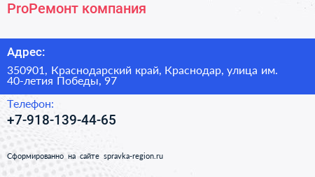 ProРемонт, компания по адресу 350901, Краснодарский край, Краснодар, улица им. 40-летия Победы, 97 в дальнейшем Организация, размещена в следующих категориях: