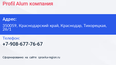 Profil Alum, компания по адресу 350059, Краснодарский край, Краснодар, Тихорецкая, 26/1 в дальнейшем Организация, размещена в следующих категориях: