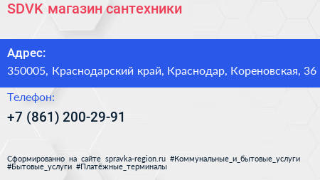 SDVK, магазин сантехники по адресу 350005, Краснодарский край, Краснодар, Кореновская, 36 в дальнейшем Организация, размещена в следующих категориях: