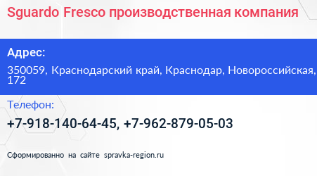 Sguardo Fresco, производственная компания по адресу 350059, Краснодарский край, Краснодар, Новороссийская, 172 в дальнейшем Организация, размещена в следующих категориях: