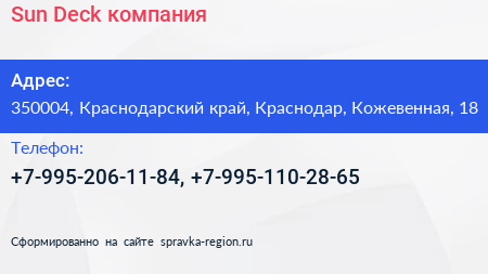 Sun-Deck, компания по адресу 350004, Краснодарский край, Краснодар, Кожевенная, 18 в дальнейшем Организация, размещена в следующих категориях: