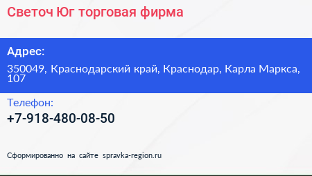 Светоч-Юг, торговая фирма по адресу 350049, Краснодарский край, Краснодар, Карла Маркса, 107 в дальнейшем Организация, размещена в следующих категориях: