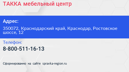 ТАККА, мебельный центр по адресу 350072, Краснодарский край, Краснодар, Ростовское шоссе, 12 в дальнейшем Организация, размещена в следующих категориях: