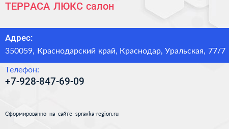 ТЕРРАСА ЛЮКС, салон по адресу 350059, Краснодарский край, Краснодар, Уральская, 77/7 в дальнейшем Организация, размещена в следующих категориях: