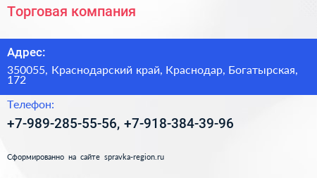 Торговая компания по адресу 350055, Краснодарский край, Краснодар, Богатырская, 172 в дальнейшем Организация, размещена в следующих категориях: