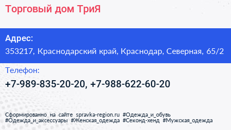 Торговый дом ТриЯ по адресу 353217, Краснодарский край, Краснодар, Северная, 65/2 в дальнейшем Организация, размещена в следующих категориях: