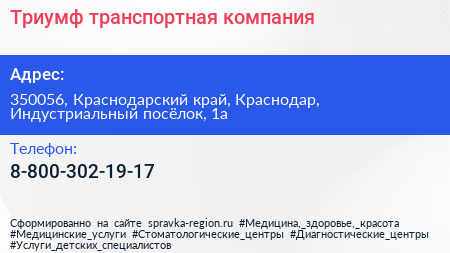 Триумф, транспортная компания по адресу 350056, Краснодарский край, Краснодар, Индустриальный посёлок, 1а в дальнейшем Организация, размещена в следующих категориях: