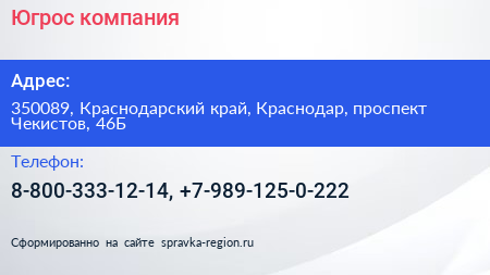 Югрос, компания по адресу 350089, Краснодарский край, Краснодар, проспект Чекистов, 46Б в дальнейшем Организация, размещена в следующих категориях: