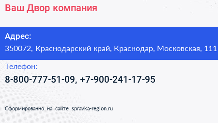 Ваш Двор, компания по адресу 350072, Краснодарский край, Краснодар, Московская, 111 в дальнейшем Организация, размещена в следующих категориях:
