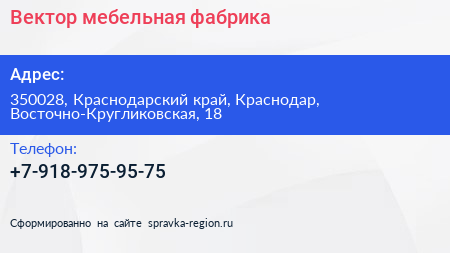 Вектор, мебельная фабрика по адресу 350028, Краснодарский край, Краснодар, Восточно-Кругликовская, 18 в дальнейшем Организация, размещена в следующих категориях: