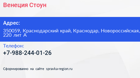 Венеция Стоун по адресу 350059, Краснодарский край, Краснодар, Новороссийская, 220 лит А в дальнейшем Организация, размещена в следующих категориях: