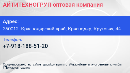 АЙТИТЕХНОГРУП, оптовая компания по адресу 350012, Краснодарский край, Краснодар, Круговая, 44 в дальнейшем Организация, размещена в следующих категориях: