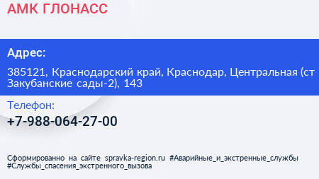 АМК ГЛОНАСС по адресу 385121, Краснодарский край, Краснодар, Центральная (ст Закубанские сады-2), 143 в дальнейшем Организация, размещена в следующих категориях: