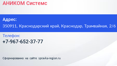 АНИКОМ Системс по адресу 350911, Краснодарский край, Краснодар, Трамвайная, 2/6 в дальнейшем Организация, размещена в следующих категориях: