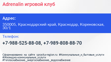 Adrenalin, игровой клуб по адресу 350005, Краснодарский край, Краснодар, Кореновская, 30/1 в дальнейшем Организация, размещена в следующих категориях: