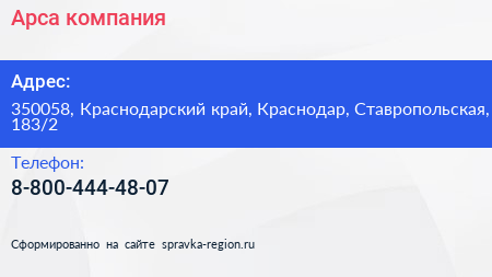 Арса, компания по адресу 350058, Краснодарский край, Краснодар, Ставропольская, 183/2 в дальнейшем Организация, размещена в следующих категориях: