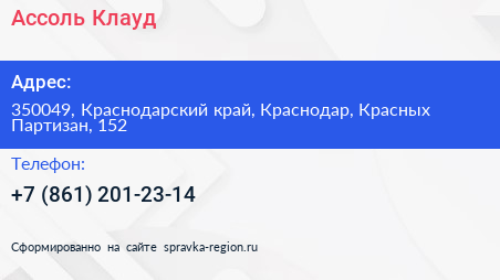 Для связи с организацией воспользуйтесь номером телефона: +7 (861) 201-23-14. Пн: c 09:00-18:00, Вт: c 09:00-18:00, Ср: c 09:00-18:00, Чт: c 09:00-18:00, Пт: c 09:00-18:00, Сб: выходной, Вс: выходной, вы можете обратиться в эту организацию.