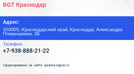 BGT Краснодар по адресу 350005, Краснодарский край, Краснодар, Александра Покрышкина, 2Б в дальнейшем Организация, размещена в следующих категориях: