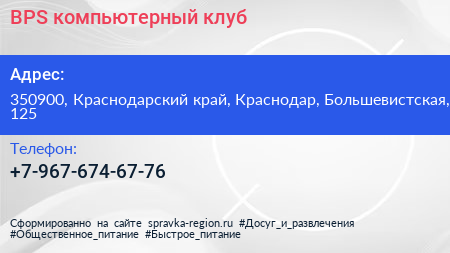BPS, компьютерный клуб по адресу 350900, Краснодарский край, Краснодар, Большевистская, 125 в дальнейшем Организация, размещена в следующих категориях: