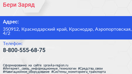 Бери Заряд по адресу 350912, Краснодарский край, Краснодар, Аэропортовская, 4/2 в дальнейшем Организация, размещена в следующих категориях: