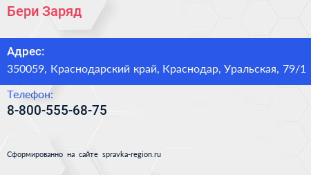 Бери Заряд по адресу 350059, Краснодарский край, Краснодар, Уральская, 79/1 в дальнейшем Организация, размещена в следующих категориях: