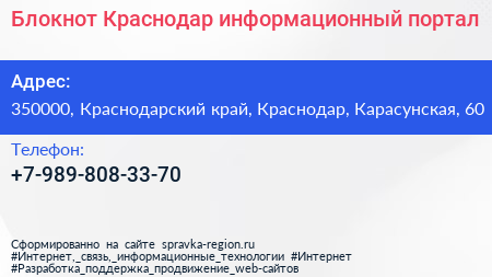 Блокнот Краснодар, информационный портал по адресу 350000, Краснодарский край, Краснодар, Карасунская, 60 в дальнейшем Организация, размещена в следующих категориях: