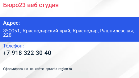 Бюро23, веб-студия по адресу 350051, Краснодарский край, Краснодар, Рашпилевская, 228 в дальнейшем Организация, размещена в следующих категориях: