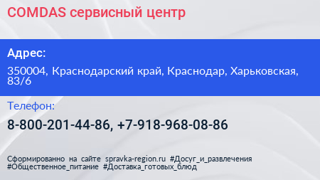 COMDAS, сервисный центр по адресу 350004, Краснодарский край, Краснодар, Харьковская, 83/6 в дальнейшем Организация, размещена в следующих категориях: