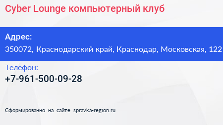 Cyber Lounge, компьютерный клуб по адресу 350072, Краснодарский край, Краснодар, Московская, 122 в дальнейшем Организация, размещена в следующих категориях: