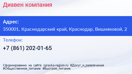 Диавен, компания по адресу 350001, Краснодарский край, Краснодар, Вишняковой, 2 в дальнейшем Организация, размещена в следующих категориях: