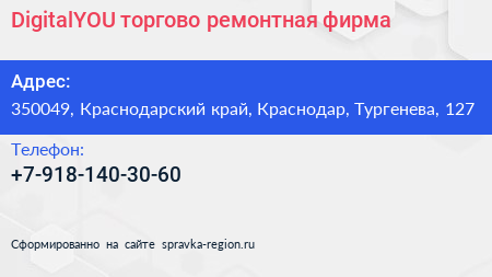 DigitalYOU, торгово-ремонтная фирма по адресу 350049, Краснодарский край, Краснодар, Тургенева, 127 в дальнейшем Организация, размещена в следующих категориях: