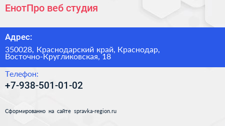 ЕнотПро, веб-студия по адресу 350028, Краснодарский край, Краснодар, Восточно-Кругликовская, 18 в дальнейшем Организация, размещена в следующих категориях: