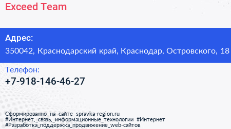 Exceed Team по адресу 350042, Краснодарский край, Краснодар, Островского, 18 в дальнейшем Организация, размещена в следующих категориях: