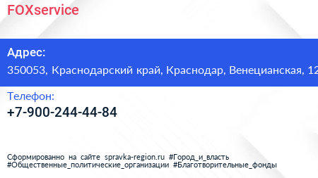 FOXservice по адресу 350053, Краснодарский край, Краснодар, Венецианская, 12 в дальнейшем Организация, размещена в следующих категориях: