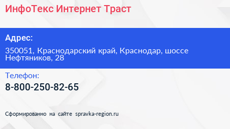 ИнфоТекс Интернет Траст по адресу 350051, Краснодарский край, Краснодар, шоссе Нефтяников, 28 в дальнейшем Организация, размещена в следующих категориях: