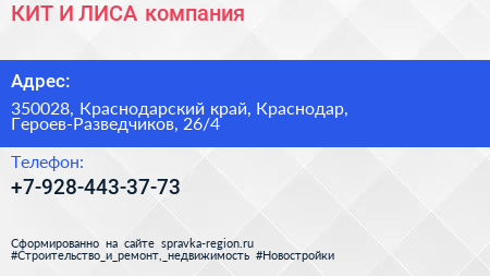 КИТ И ЛИСА, компания по адресу 350028, Краснодарский край, Краснодар, Героев-Разведчиков, 26/4 в дальнейшем Организация, размещена в следующих категориях: