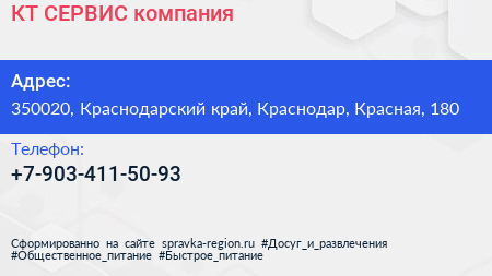 КТ-СЕРВИС, компания по адресу 350020, Краснодарский край, Краснодар, Красная, 180 в дальнейшем Организация, размещена в следующих категориях: