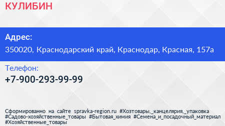КУЛИБИН по адресу 350020, Краснодарский край, Краснодар, Красная, 157а в дальнейшем Организация, размещена в следующих категориях: