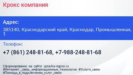 Крокс, компания по адресу 385140, Краснодарский край, Краснодар, Промышленная, 1 в дальнейшем Организация, размещена в следующих категориях: