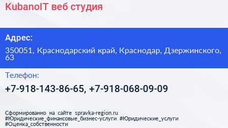 KubanoIT, веб-студия по адресу 350051, Краснодарский край, Краснодар, Дзержинского, 63 в дальнейшем Организация, размещена в следующих категориях: