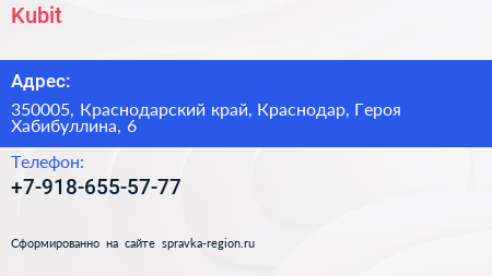 Kubit по адресу 350005, Краснодарский край, Краснодар, Героя Хабибуллина, 6 в дальнейшем Организация, размещена в следующих категориях: